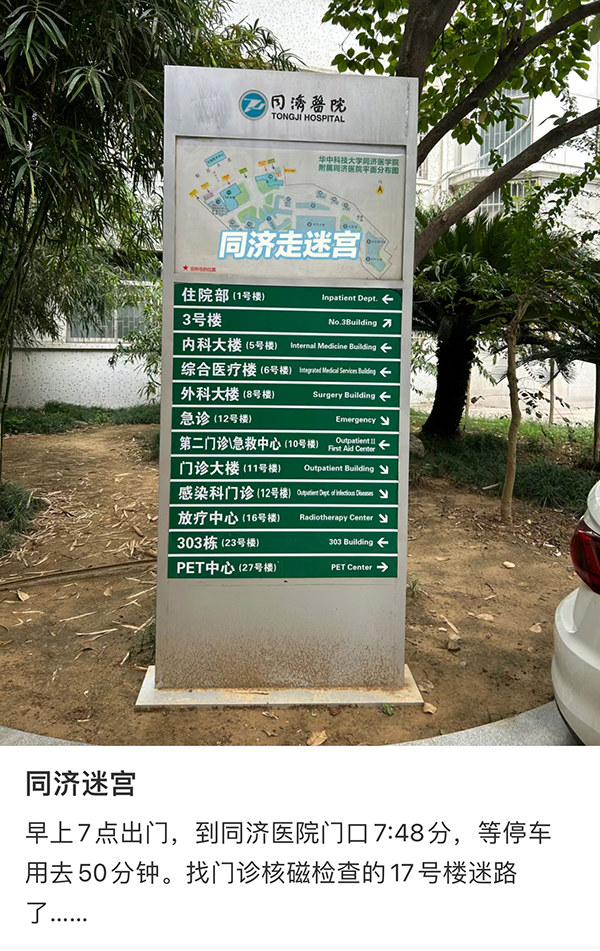 一位網(wǎng)名“心情的風(fēng)”的博主分享,在同濟(jì)醫(yī)院像走迷宮一般,找17號(hào)樓的時(shí)候迷路了,醫(yī)院指示牌上有1號(hào)樓、5號(hào)樓、10號(hào)樓、16號(hào)樓、23號(hào)樓......卻沒(méi)有17號(hào)樓。