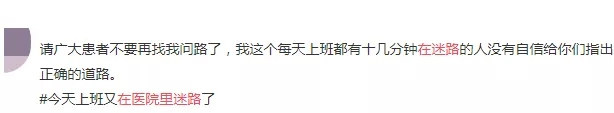 有博主分享,“在大醫(yī)院找不到路,繞了好幾圈后終于找到了,上個(gè)樓找醫(yī)生簽字下樓后又迷路了,在找路的沿途,還遇到5個(gè)人來(lái)問(wèn)我,然而我也不知道......”