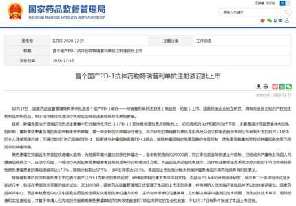 ◎ 2018年12月17日,首個(gè)國產(chǎn)PD-1抗體藥物特瑞普利單抗注射液獲批上市。/ 國家藥品監(jiān)督管理局官網(wǎng)截圖